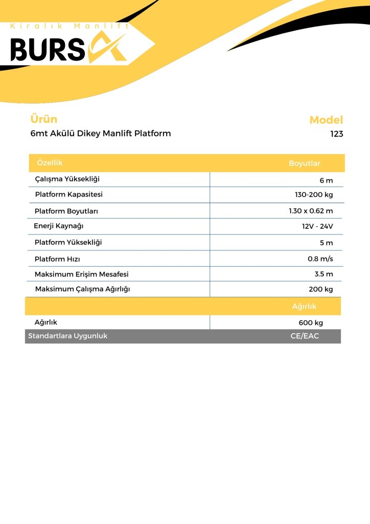 Bursa Manliftten Dikey Akülü Platform 6 Metre