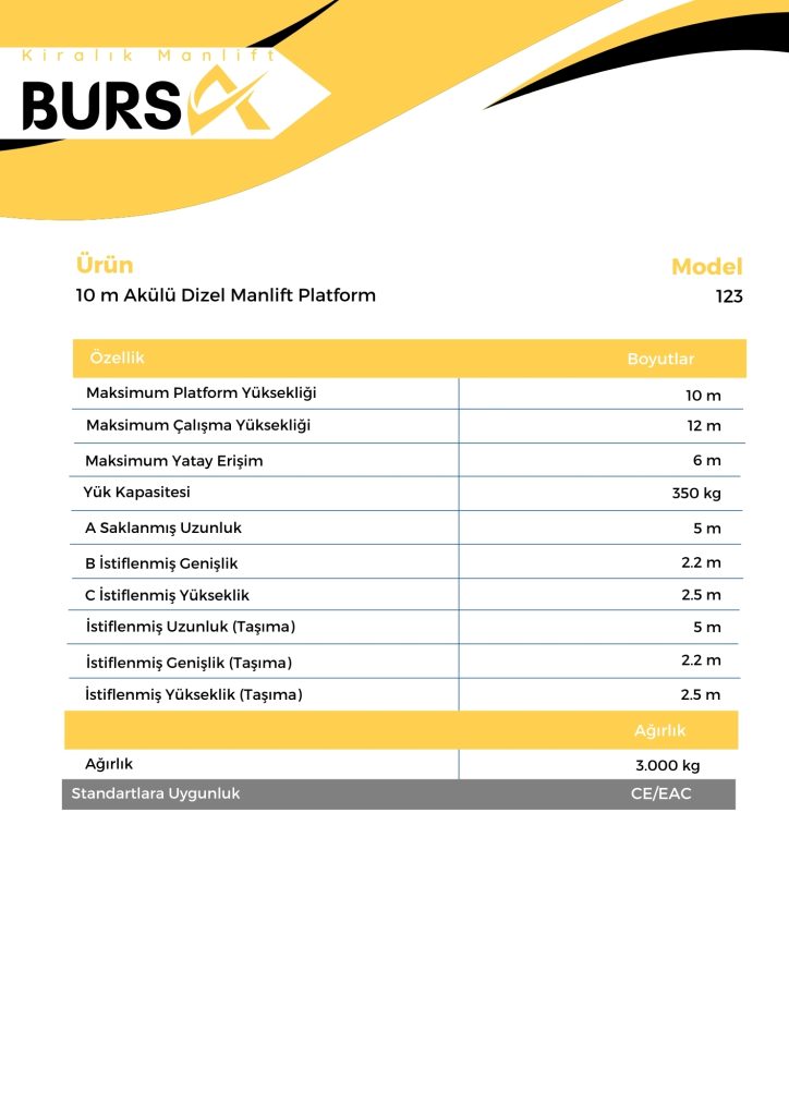 Bursa Dizel Manlift 10 Metrelik Platform