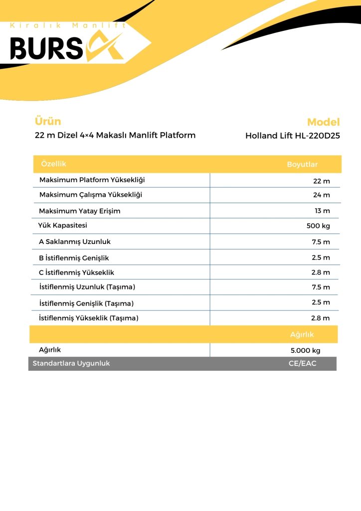 Holland Lift HL-220D25 Dizel 4×4 Makaslı Manlift Platform 22 Metrelik
